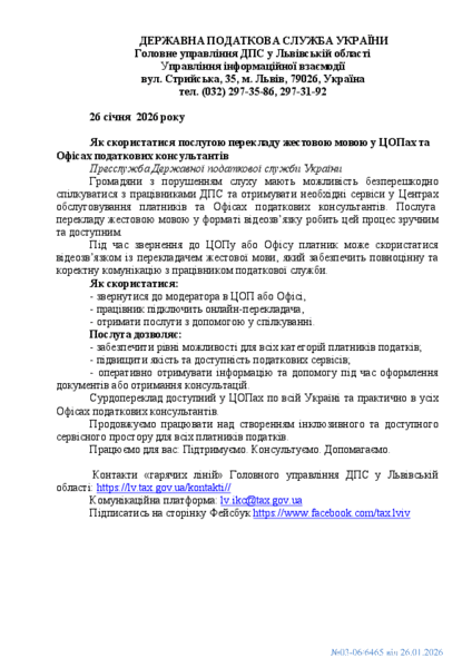 Під час звернення до ЦОПу або Офісу платник може скористатися відеозв’язком із перекладачем жестової мови, який забезпечить повноцінну та коректну комунікацію з працівником податкової служби.