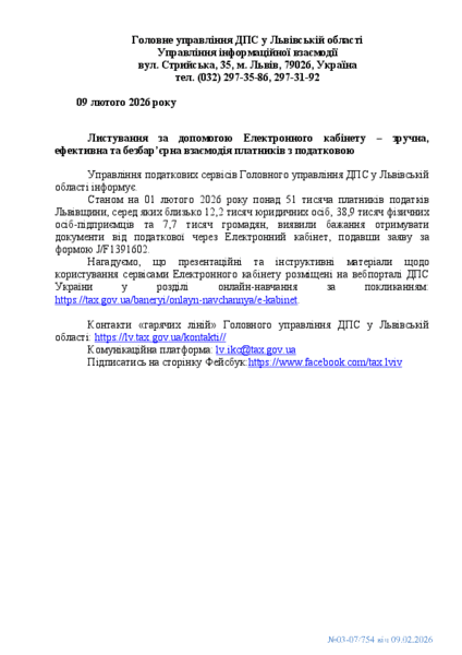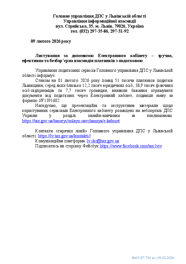 Станом на 01 лютого 2026 року понад 51 тисяча платників податків Львівщини, серед яких близько 12,2 тисяч юридичних осіб, 38,9 тисяч фізичних осіб-підприємців та 7,7 тисяч громадян, виявили бажання отримувати документи від податкової через Електронний кабінет, подавши заяву за формою J/F1391602.