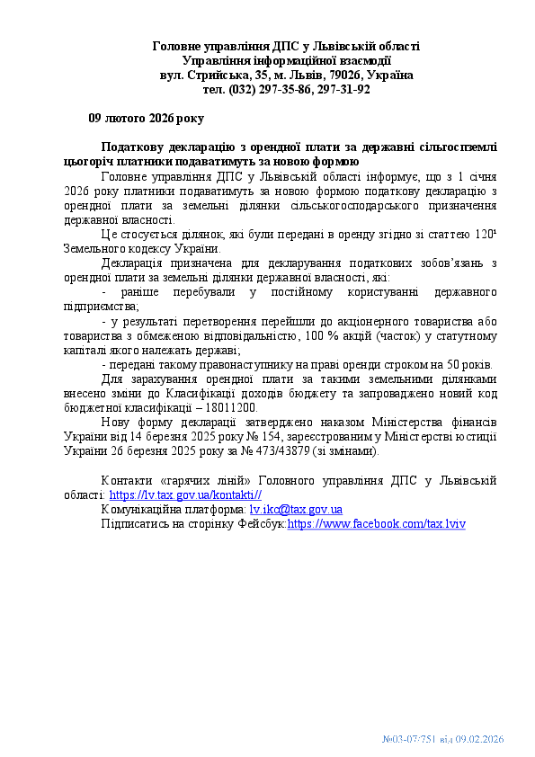 Податкову декларацію з орендної плати за державні сільгоспземлі цьогоріч платники подаватимуть за новою формою Головне управління ДПС у Львівській області інформує, що з 1 січня 2026 року платники подаватимуть за новою формою податкову декларацію з орендної плати за земельні ділянки сільськогосподарського призначення