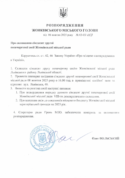 72-а позачергова сесія Жовківської міської ради 08 жовтня 2025 року о 16 годині 00 хвилин, відбудеться засідання 72-ї позачергової сесії Жовківської міської ради в сесійній залі за адресою м. Жовква, вул. Львівська, 40. ПОРЯДОК ДЕННИЙ 06.10.2025 | Категорія: Загальні новини