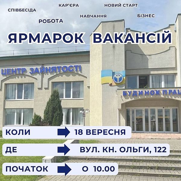 У четвер, 18 вересня, у Львівському Будинку праці (м. Львів, вул. Княгині Ольги, 122) відбудеться Ярмарок вакансій. Початок заходу о 10:00.