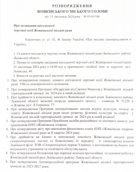 60-а сесія Жовківської міської ради 25.11.2024 року 25 листопада 2024 року о 10 годині 00 хвилин, відбудеться засідання 60-Ї сесії Жовківської міської ради в сесійній залі за адресою м. Жовква, вул. Львівська, 40. ПОРЯДОК ДЕННИЙ 15.11.2024 | Автор: Жовківська мр Категорія: Загальні новини