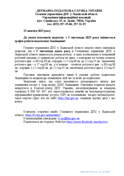 До уваги платників податків: з 3 листопада 2025 року змінюється графік роботи податкової Львівщини!