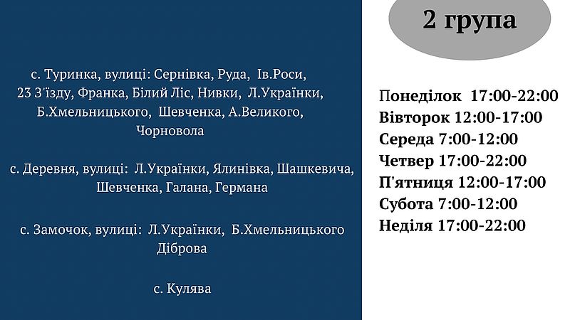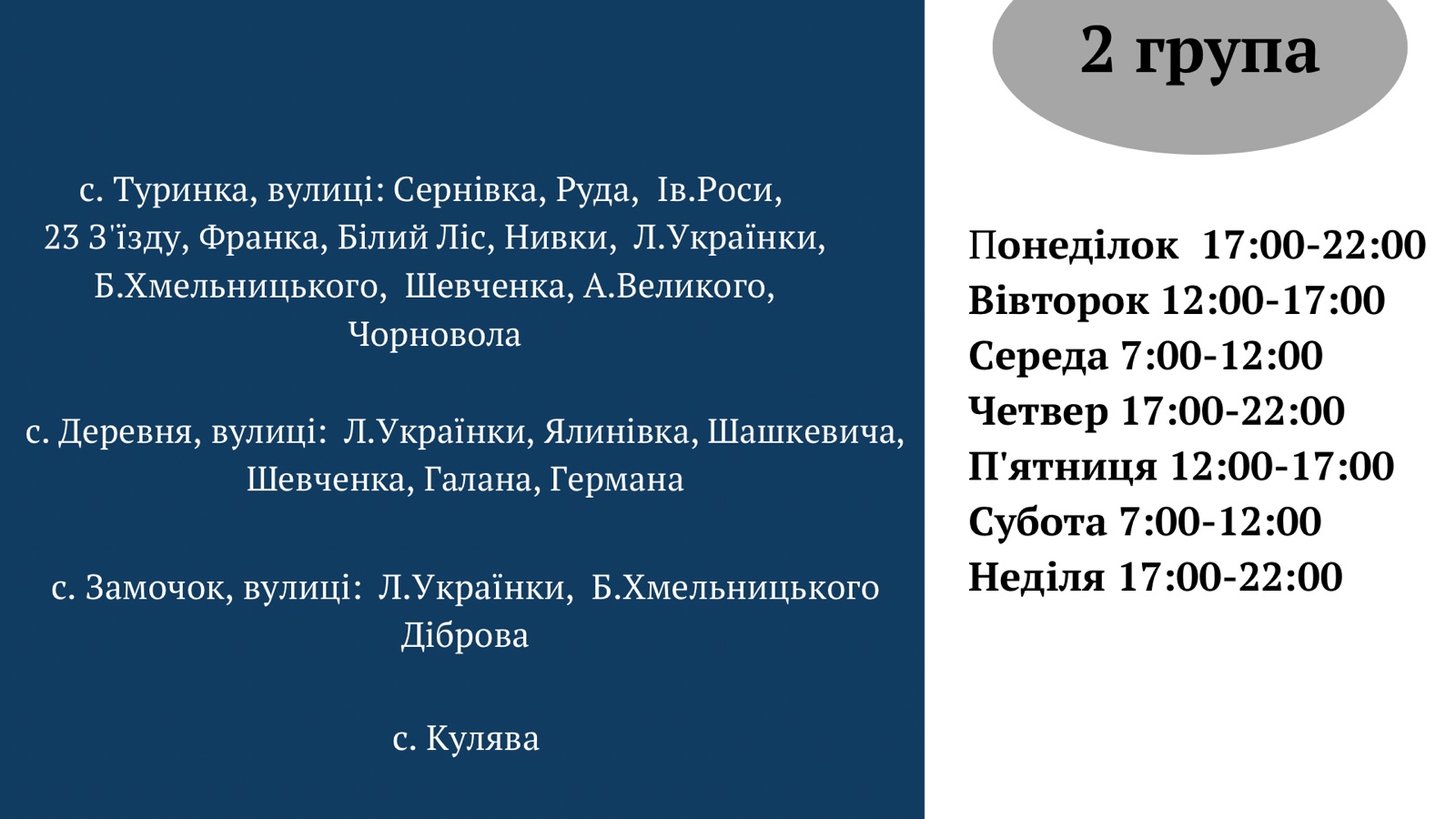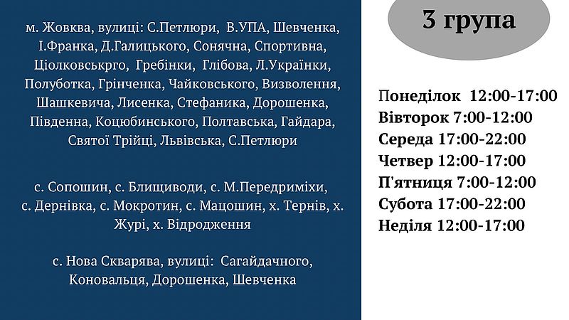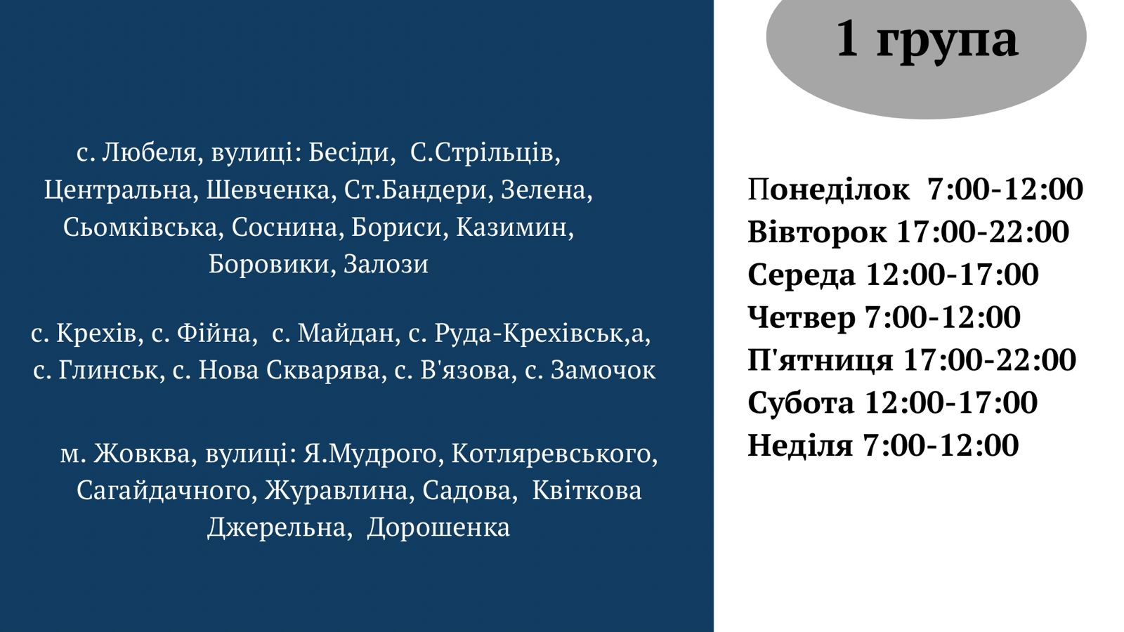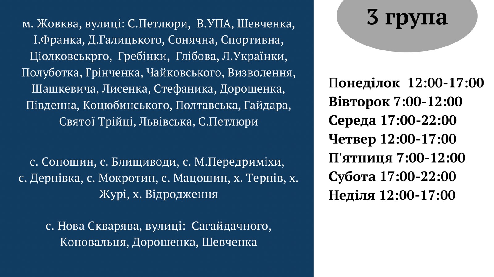 Графік відключень електроенергії Шановні мешканці Жовківської громади! Просимо Вас ознайомитися з графіком планових відключень електроенергії, затвердженого «Львівобленерго». Попередньо, графік є актуальним до кінця поточного тижня. Усі населені пункти поділені на 3 групи, в кожній з яких відключення світла триватиме до 5-ти годин. 31.10.2022 | Категорія: Загальні новини