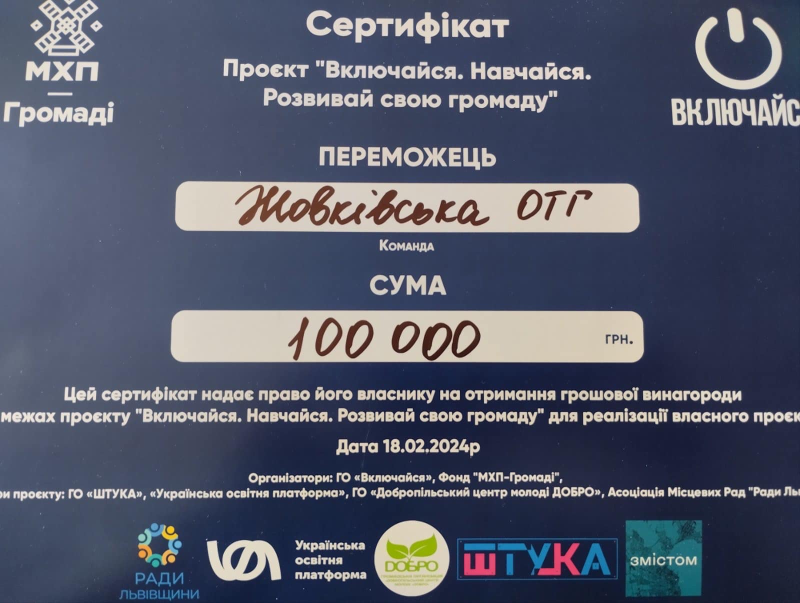 Впродовж 16-18 лютого 2024 року у м. Трускавець відбувався Навчальний хакатон Проекту «Включайся. Навчайся. Розвивай свою громаду» організованого ГО «Включайся» та Фонд "МХП-Громаді" спільно з ГО «ШТУКА», Українська освітня платформа, ГО «Добропільський центр молоді ДОБРО», Асоціація Місцевих Рад "Ради Львівщини"
