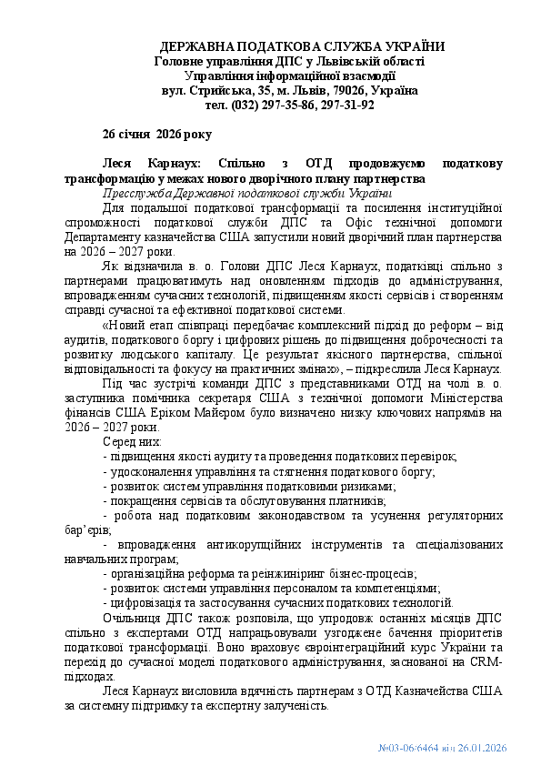 Для подальшої податкової трансформації та посилення інституційної спроможності податкової служби ДПС та Офіс технічної допомоги Департаменту казначейства США запустили новий дворічний план артнерства на 2026 – 2027 роки.