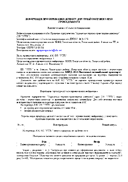 Товариство з обмеженою відповідальністю Приватне підприємство ”Українська торгово-транспортна компанія” Про клопотання щодо отримання дозволу на викиди забруднюючих речовин в атмосферне повітря. 1. Повне найменування суб’єкта господарювання: Приватне підприємство ”Українська торгово-транспортна компанія”; Скорочене найменування суб’єкта господарювання: ПП ”УТТК”; 2. Ідентифікаційний код юридичної особи в ЄДРПОУ: 36762258; 3. Місцезнаходження суб’єкта господарювання: 80300, Львівська область, Львівський район, Жовківська ТГ, м. Жовква, вул. Вокзальна, 14; Контактний номер телефону: (098)-931-01-06; Електронна пошта: agroprompostach@ukr.net; 4. Місцезнаходження об’єкта/промислового майданчика: 80300, Львівська область, Львівський район, Жовківська ТГ, м. Жовква, вул. Вокзальна, 14; 5. Мета отримання дозволу на викиди: Отримання дозволу на викиди для діючого об’єкту; 6. Відомості про наявність висновку з оцінки впливу на довкілля: Виробнича діяльність, яку здійснює ПП ”УТТК” не підлягає оцінці впливу на довкілля та прямо не передбачена вимогами ч. 2 та ч. 3 ст. 3 Закону України «Про оцінку впливу на довкілля»; 7. Загальний опис об’єкта (опис виробництв та технологічного устаткування): ПП ”УТТК” надає послуги з перевезення вантажів за допомогою вантажних автомобілів (КВЕД: 49.41 Вантажний автомобільний транспорт). Підприємство встановило резервуар зберігання дизпалива з паливо роздавальною колонкою для забезпечення власного автотранспорту пальним; 8. Відомості щодо видів та обсягів викидів (т/рік): Вуглеводні насичені C12-C19 – 0,0259; 9. Заходи щодо впровадження найкращих існуючих технологій виробництва, що виконані або/та які потребують виконання: Всі проммайданчики відноситься до третьої групи об’єктів за ступенем впливу на забруднення атмосферного повітря і не мають виробництв або технологічного устаткування, на як их повинні впроваджуватися найкращі доступні технології та методи керування. Впровадження заходів щодо впровадження найкращих існуючих технологій виробництва, що виконані або/та які потребують виконання не передбачено; 10. Перелік заходів щодо скорочення викидів: Не передбачено; 11. Дотримання виконання природоохоронних заходів щодо скорочення викидів: Не передбачено; 12. Відповідність пропозицій щодо дозволених обсягів викидів законодавству: Для визначення рівня забруднення атмосферного повітря в районі розташування виробничого майданчику ПП ”УТТК” було проведено розрахунок розсіювання забруднюючих речовин від викидів стаціонарних джерел підприємства та заміри концентрацій забруднюючих речовин в атмосферному повітрі на межі санітарно-захисної зони. Ні для одного з дозволених викидів не перевищуються граничнодопустимі рівні викидів забруднюючих речовин в атмосферне повітря. Інші викиди в атмосферу, що чинять суттєвий вплив відсутні. Викиди забруднюючих речовин не перевищують гігієнічних нормативів та відповідають вимогам чинного законодавства. 13. Адреса обласної, Київської, Севастопольської міської держадміністрації, органу виконавчої влади Автономної Республіки Крим з питань охорони навколишнього природного середовища, до якої можуть надсилатися зауваження та пропозиції громадськості щодо дозволу на викиди: Львівська обласна державна адміністрація (Департамент екології та природних ресурсів Львівської обласно
