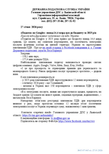 «Податок на Google» у 2025 році приніс до бюджету понад 14,4 млрд гривень. Це кошти, які сплатили нерезиденти, які постачають електронні послуги фізичним особам на митній території України та зареєстровані платниками ПДВ. Про це на своїй сторінці у Facebook повідомила в. о. Голови Державної податкової служби Леся Карнаух.
