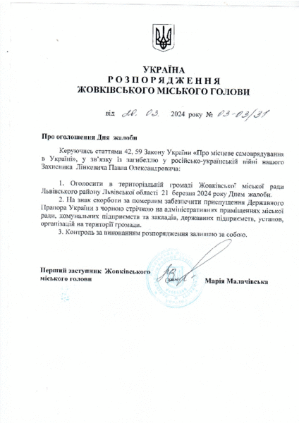 На знак скорботи за загиблим Героєм - Лінкевичом Павлом, забезпечити припущення Державного Прапора України з чорною стрічкою на адміністративних приміщеннях міської ради, комунальних підприємств та закладів, державних підприємств, установ, організацій на території громади.