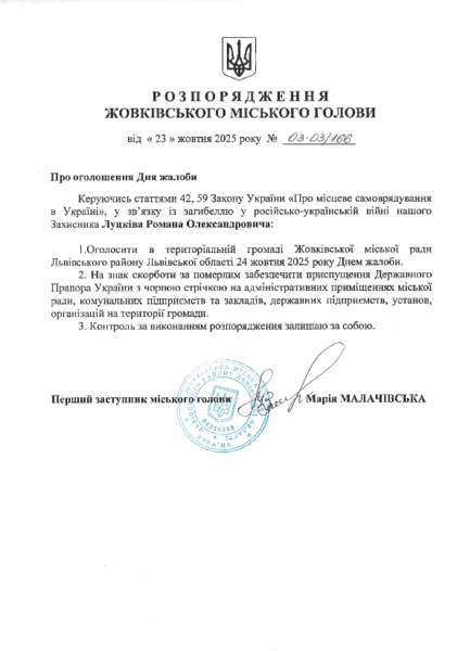 Відповідно до розпорядження міського голови Олега Вольського, оголошено в територіальній громаді Жовківської міської ради Львівського району Львівської області 24 жовтня 2025 року Днем жалоби. На знак скорботи за загиблим Героєм - Романом Луцків, забезпечити припущення Державного Прапора України з чорною стрічкою на адміністративних приміщеннях міської ради, комунальних підприємств та закладів, державних підприємств, установ, організацій на території громади.