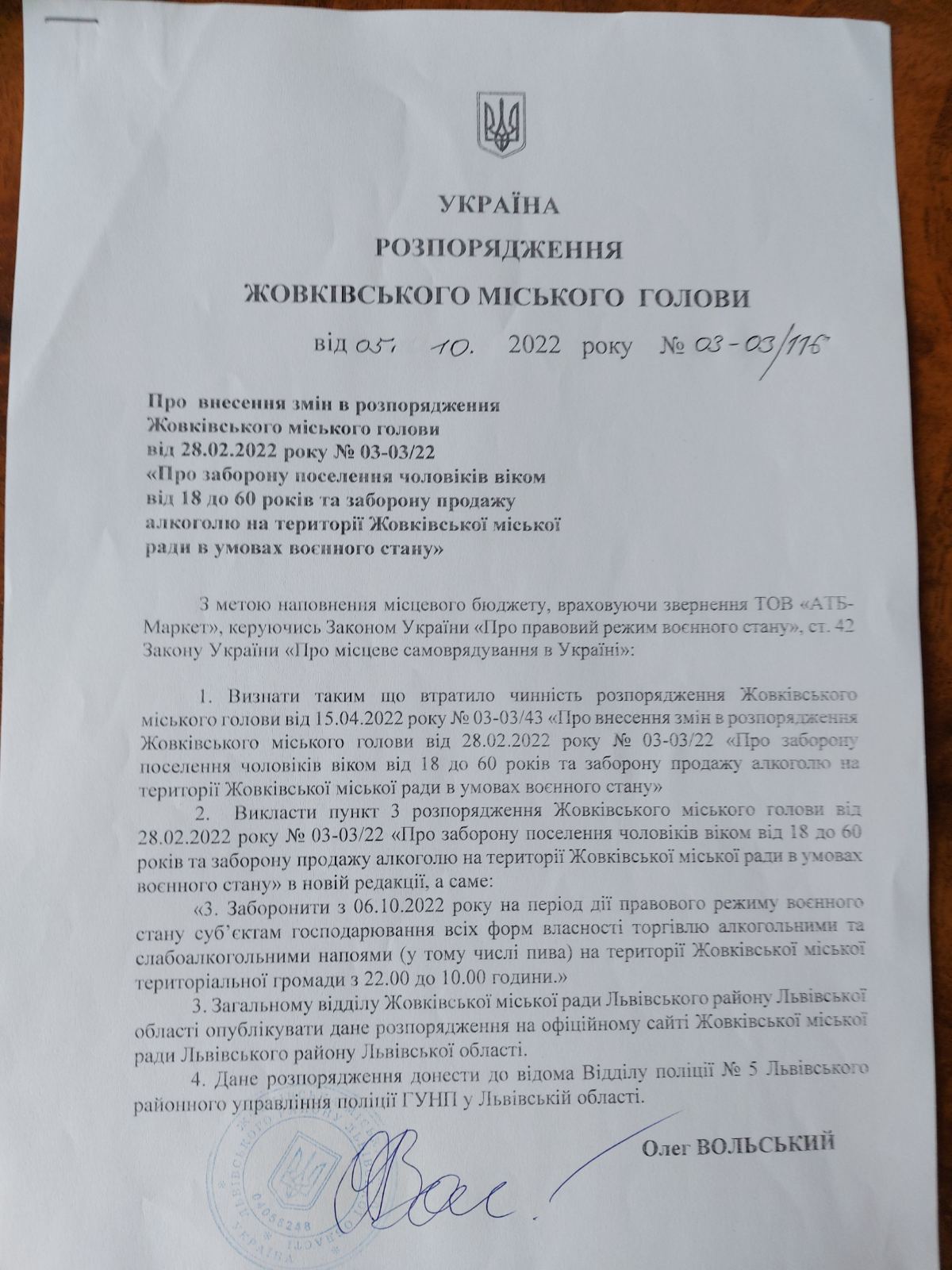 2. Викласти пункт 3 розпорядження Жовківського міського голови від 28.02.2022 року № 03-03/22 «Про заборону поселення чоловіків віком від 18 до 60 років та заборону продажу алкоголю на території Жовківської міської ради в умовах воєнного стану» в новій редакції, а саме: