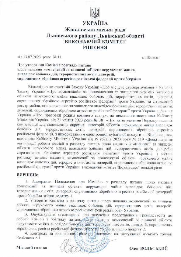 Жовківська міська рада відповідно до пункту 7 Порядку