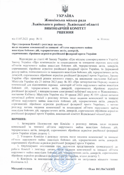 надання компенсації для відновлення окремих категорій об’єктів нерухомого майна, пошкоджених внаслідок бойових дій, терористичних актів, диверсій, спричинених збройною агресією російської федерації, з використанням електронної публічної послуги “єВідновлення”, затвердженого постановою Кабінету Міністрів України від 21 квітня 2023 року № 381 (зі змінами) оголошує про залучення представників громадськості до роботи Комісії з розгляду питань надання компенсації за пошкоджені об'єкти нерухомого майна внаслідок бойових дій, терористичних актів, диверсій, спричинених збройною агресією російської федерації проти України (далі – Комісія).