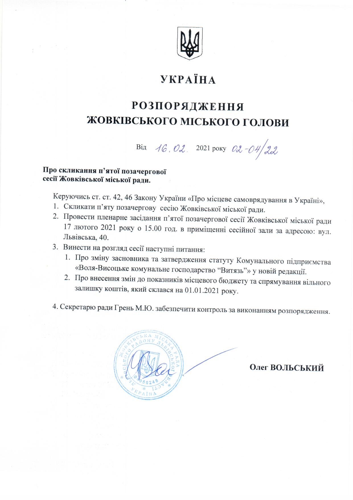 17 лютого 2021 року о 15 годині 00 хвилин, відбудеться позачергове засідання п’ятої сесії Жовківської міської ради в сесійній залі за адресою м. Жовква, вул. Львівська, 40