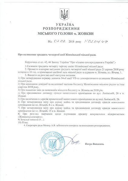 Скликання тридцять четвертої сесії Жовківської міської ради