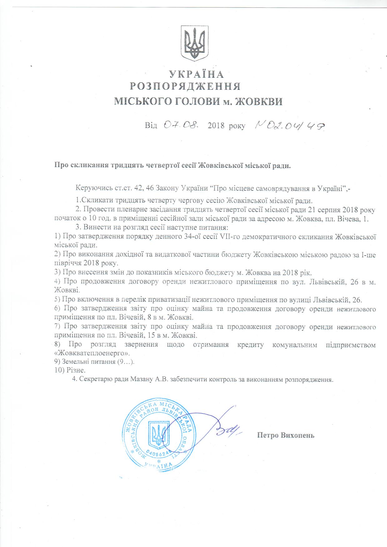 21 серпня 2018 року о 10 годині 00 хвилин, відбудеться пленарне засідання тридцять четвертої чергової сесії Жовківської міської ради в приміщені сесійної зали міської ради за адресою м. Жовква, пл. Вічева, 1.
