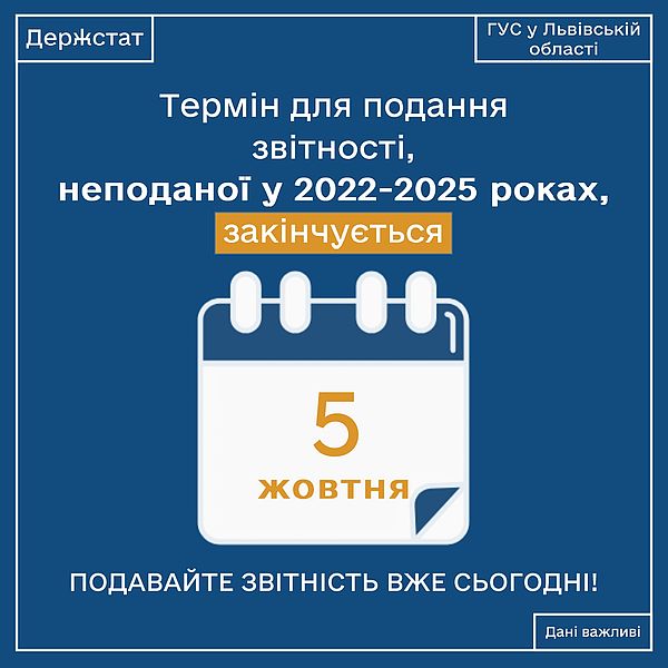 Відновлено обов’язкове подання державної статистичної та фінансової звітності. 5 жовтня 2025 року завершується перехідний період подання статистичної та фінансової звітності, неподаної за 2022–2025 роки.Подайте звітність завчасно – це допоможе уникнути технічних збоїв і забезпечить врахування ваших даних швидко та якісно.Подати звіти можна швидко та зручно онлайн: перевірити, які саме форми потрібно подати https://ess.ukrstat.gov.ua/скористатися «Кабінетом респондента» https://statzvit.ukrstat.gov.ua/Відповіді на найпоширеніші питання – на сайті в розділі «Для респондентів» - «Відновлення звітування»: https://www.lv.ukrstat.gov.ua/ukr/sr/quest_ask.phpІнформаційна підтримка респондентів:(032) 258 59 49, (032) 258 59 20, 096 868 47 65 (пн–пт 830–1230, 1300–1700)ve@remove-this.lv.ukrstat.gov.uaДякуємо за вашу відповідальність і підтримку! Разом ми повертаємо не лише звітність. Ми повертаємо дані, довіру і розвиток. 26.09.2025 | Категорія: Загальні новини