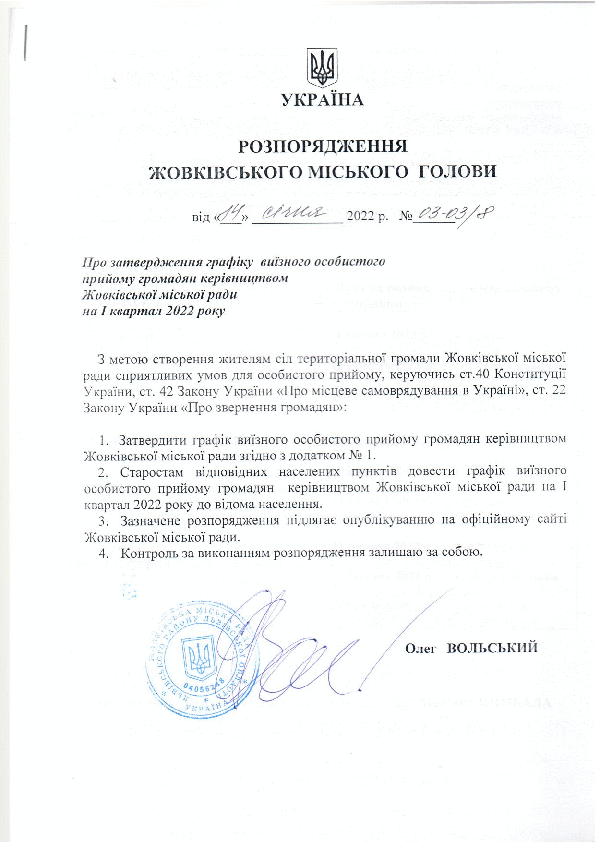 Жовківський міський голова Вольський Олег Іванович: 04 лютого 2022 року в с. Крехів з 10 до 12 год. та 15 березня 2022 року в с. Стара Скварява з 10 до 12 год. (приміщення сільських рад)
