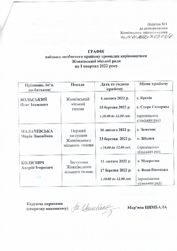 Перший заступник Жовківського міського голови Малачівська Марія Зіновіївна: 16 лютого 2022 року в с. Замочок з 10 до 12 год. та 23 березня 2022 року в с. Зіболки з 10 до 12 год. (приміщення сільських рад)