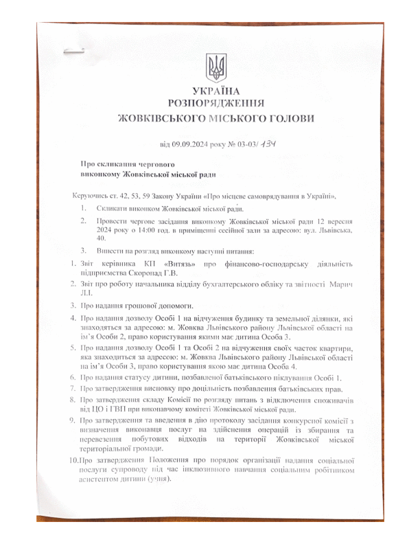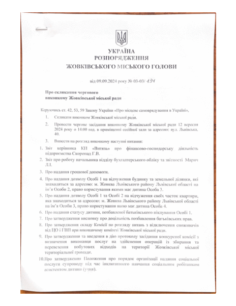 Засідання виконавчого комітету 12 вересня 2024 року 12 вересня 2024 року о 14 годині 00 хвилин, відбудеться засідання чергового виконавчого комітету Жовківської міської ради в сесійній залі за адресою м. Жовква, вул. Львівська, 40.Порядок денний 09.09.2024 | Автор: Жовківська мр Категорія: Загальні новини